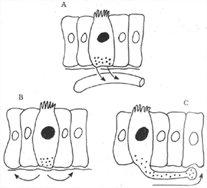 胃肠内分泌细胞在形成上有两个明显的特点,一是细胞内的分泌颗粒均分布在核和基底之间,故属于基底颗粒细胞。不同的内分泌细胞的分泌颗粒大小、形状和密度均不同。胃肠内分泌细胞的另一特点是,大部分细胞呈锥形,其顶端有绒毛突起,伸入胃肠腔内(图6-6),微绒毛可直接感受胃肠内食物成分和pH的一刺激而引起细胞的分泌活动。只有少数胃肠内分泌细胞无微绒毛,它们与胃肠腔无直接接触,它们的分泌可由神经兴奋或局部内环境的变化而引起,而与胃肠腔内的食物成分无关。这两种类型的细胞,前者被称为开放型细胞,后者为闭合型细胞。