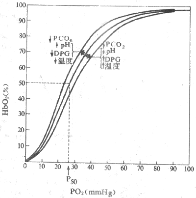 总之,血液Hb的运O2量可受多种因素影响:包括PO2、Hb本身的性质和含量、pH、PCO2、温度、2,3-DPG和CO等,pH降低,PCO2升高,温度升高,2,3-DPG增高,氧离曲线右移;pH升高,PCO2、温度、2,3-DPG降低和CO中毒,曲线左移。