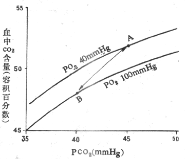 图5-16的A点是静脉血PO25.32kPa(40mmHg),PCO26kPa(45mmHg)时的CO2含量,约为52ml%;B点是动脉血PO213.3kPa(100mmHg),PCO25.32kPa(40mmHg)时的CO2含量,约为48ml%,血液流经肺时通常释出CO24ml/100ml血液。