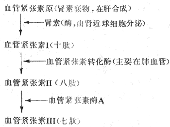 肾素是由肾近球细胞合成和分泌的一种酸性蛋白酶,经肾静脉进入血循环。血浆中的肾素底物,即血管紧张素原,在肾素的作用下水解,产生一个十肽,为血管紧张素I。在血浆和组织中,特别是在肺循环血管内皮表面,存在有血管紧张素转换酶,在后者的作用下,血管紧张素I水解,产生一个八肽,为血管紧张素Ⅱ。血管紧张素Ⅱ在血浆和组织中的血管紧张素酶A的作用下,再失去一个氨基酸,成为七肽血管紧张素Ⅲ。上述过程可由图4-28表示。血管紧张素Ⅱ和血管紧张素Ⅲ作用于血管平滑肌和肾上腺皮质等细胞的血管紧张素受体,引起相应的生理效应。