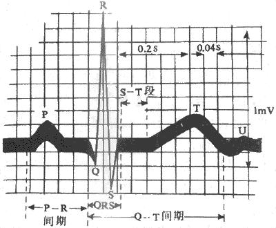 正常典型心电图的波形及其生理意义 心电图记录纸上有横线和纵线划出长和宽均为1mm的小方格。记录心电图时,首先调节仪器放大倍数,使输入1mV电压信号时,描笔在纵向上产生10mm偏移,这样,纵线上每一小格相当于0.1mV的电位差。横向小格表示时间,每一小格相当于0.04s(即走纸速度为每秒25mm)。因此,可以在记录纸上测量出心电图各波的电位数值和经历的时间。