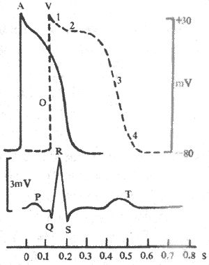 图4-15心肌细胞电变化曲线与常规心电图的比较