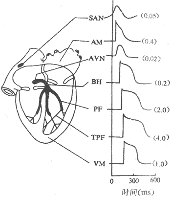 SAM:窦房结 AM:心房肌 AVN;结区 BH:希氏束 PE;哺肯野纤维