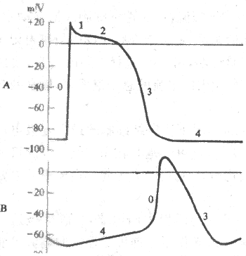 图4-8 心室肌(A)与窦房结(B)细胞跨膜电位的比较
