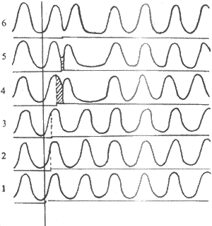 以下实验可以说明心肌组织的这一特点。正常情况下,窦房结产生的每一次兴奋传播到心房肌或心室肌的时间,都是在它们前一次兴奋的不应期终结之后,因此,整个心脏能够按照窦房结的节律而兴奋。但在某些情况下,如果心室在有效不应期之后受到人工的或窦房结之外的病理性异常异常刺激,则可产生一次期前兴奋,引起期前收缩或额外收缩。期前兴奋也有它自己的有效不应期,这样,当紧接在期前兴奋之后的一次窦房结兴奋传到心室肌时,常常正好落在期前兴奋的有效不应期内,因而不能引起心室兴奋和收缩,形成一次“脱失”,必须等到再下一次窦房结的兴奋传到心室时才能引起心室收缩。这样,在一次期前收缩之后往往出现一段较长的心室舒张期,称为代偿性间歇(图4-11)。随之,才恢复窦性节律。