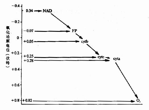 1.根据各种组分的标准氧化还原电位来确定。标准氧化还原电位的数值表示氧化还原能力的大小,标准氧化还原电位负值越大,其还原性越强,容易被氧化;标准氧化还原电位正值越大,其氧化性越强,容易被还原。因此呼吸链中各种组分的排列顺序应当由低电位依次向高电位排列(图-4)。