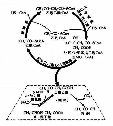 在3-羟-3-甲基戊二酰CoA(hydroxy methyl glutarylCoA,HMGCoA)合成酶催化下,乙酰乙酰CoA再与一分子乙酰CoA反应,生成HMGCoA,并释放出一分子辅酶。这一步反应是酮体生成的限速步骤。