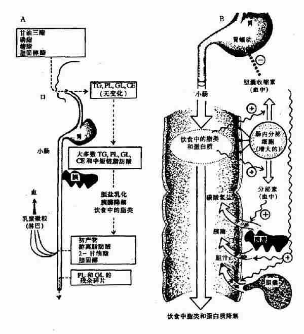 图5-1 脂类消化A.概貌 B.小肠中脂类代谢的激素控制