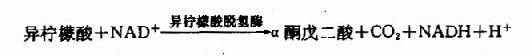 在异柠檬酸脱氢酶作用下,异柠檬酸的仲醇氧化成羰基,生成草酰琥珀酸(oxalosuccinate)的中间产物,后者在同一酶表面,快速脱羧生成α-酮戊二酸(αketoglutarate)、NADH和CO2,此反应为β-氧化脱羧,此酶需要Mn2+作为激活剂。