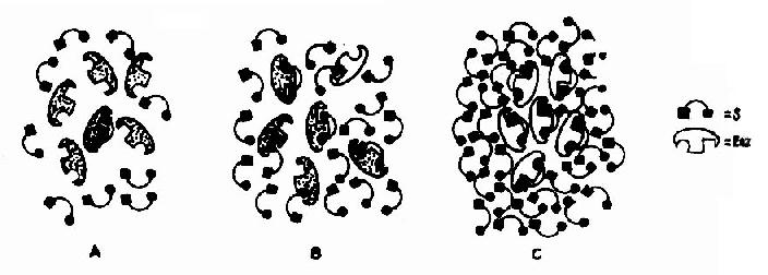 在底物浓度很低时,反应速度随底物浓度的增加而急骤加快,两者呈正比关系,表现为一级反应。随着底物浓度的升高,反应速度不再呈正比例加快,反应速度增加的幅度不断下降。如果继续加大底物浓度,反应速度不再增加,表现为0级反应。此时,无论底物浓度增加多大,反应速度也不再增加,说明酶已被底物所饱和。所有的酶都有饱和现象,只是达到饱和时所需底物浓度各不相同而已。