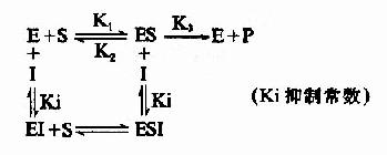 抑制剂I和底物S与酶E的结合完全互不相关,既不排斥,也不促进结合,抑制剂I可以和酶E结合生成EI,也可以和ES复合物结合生成ESI。底物S和酶E结合成ES后,仍可与I结合生成ESI,但一旦形成ESI复合物,再不能释放形成产物P。
