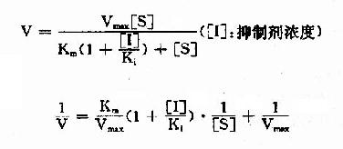 按米氏公式推导方法,也可演算出竞争性抑制时,抑制剂、底物和反应速度之间的动力学关系及其双倒数方程式为: