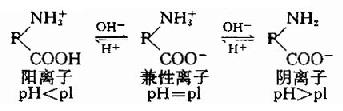 蛋白质是由氨基酸组成的,其分子中除两端的游离氨基和羧基外,侧链中尚有一些解离基,如谷氨酸、天门冬氨酸残基中的γ和β-羧基,赖氨酸残基中的ε-氨基,精氨酸残基的胍基和组氨酸的咪唑基。作为带电颗粒它可以在电场中移动,移动方向取决于蛋白质分子所带的电荷。蛋白质颗粒在溶液中所带的电荷,既取决于其分子组成中碱性和酸性氨基酸的含量,又受所处溶液的pH影响。当蛋白质溶液处于某一pH时,蛋白质游离成正、负离子的趋势相等,即成为兼性离子(zwitterion,净电荷为O),此时溶液的pH值称为蛋白质的等电点(isoelectric point,简写pI)。处于等电点的蛋白质颗粒,在电场中并不移动。蛋白质溶液的pH大于等电点,该蛋白质颗粒带负电荷,反之则带正电荷。