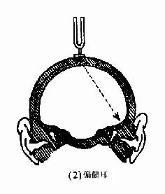(三)音叉检查:(tuning-fork test)是鉴别耳聋性质最常用的方法。常用C调倍频程五支一组音叉,其振动频率分别为128、256、512、1024、和2048Hz。检查时注意:①应击动音叉臂的上1/3处;②敲击力量应一致,不可用力过猛或敲击台桌硬物,以免产生泛音;③检查气导时应把振动的音叉上1/3的双臂平面与外耳道纵轴一致,并同外耳道口同高,距外耳道口约1cm左右;④检查骨导时则把柄底置于颅面;⑤振动的音叉不可触及周围任何物体。常用的检查方法如下: