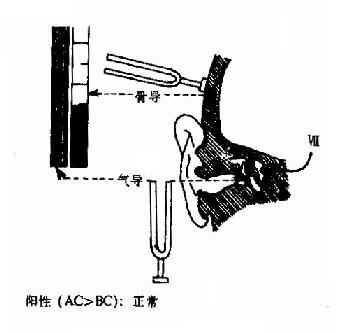正常人气导比骨导时间长1~2倍,为林纳试验阳性.传导性聋因气导障碍,则骨导比气导长,为阴性.感音神经性聋气导及骨导时间均较正常短,且听到声音亦弱故为短阳性.气导与骨导时间相等者(AC=BC,RT“±”)亦属传导性聋。