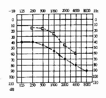 ③混合性聋(图2-27):骨导曲线下降,气导曲线又低于骨导曲线。