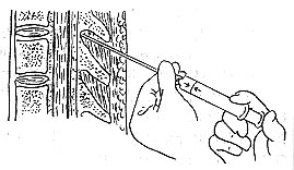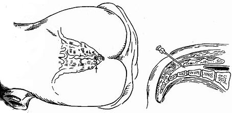 骶管穿刺法:为经骶裂孔而达骶部硬膜外腔的穿刺法。第五骶椎没有棘突,且左右椎板未在中线合拢,其间的裂孔即为骶袭孔,两旁各有一豆大的骶角,用手指由尾骨尖沿背正中线向上约3厘米,摸到的凹陷即是。穿刺采用伏卧位或侧卧位,在骶裂孔中心,以20~22号针穿刺,经皮肤、皮下及穿过骶尾韧带,有一明显突破感,表示进入骶管腔内,回抽无血和脑脊液,即可注药(图1-39)。