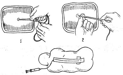 判断穿刺针进入硬膜外腔的方法:①穿过黄韧带时阻力突然消失,回抽无脑脊液。②负压试验:用一带水柱的细玻璃管,接上穿刺针,穿过黄韧带进入硬膜外腔,玻璃管内的液体被硬膜外腔负压吸入。亦可用悬滴法试验。③阻力试验:用一5毫升注射器,内装少量生理盐水或局麻药,并保留一小气泡,接上穿刺针。轻轻推动注射器芯,如有阻力,则气泡压缩变小,说明针尖未在硬膜外腔,如无任何阻力,气泡不被压缩,说明在硬膜外腔。同样于注射器内装数毫升空气,如针尖不在硬膜外腔时,则注气有明显阻力,在硬外腔则注气无阻力。注气后,立即取下注射器,有时能看到气泡由穿刺针尾涌出现象(图1-35,1-36,1-37)。