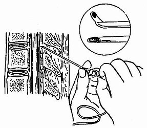 穿刺术有直入法与侧入法两种。病人准备与腰麻同。选择好穿刺间隙后,直入法是在穿刺间隙中点进行,穿过皮肤、棘上韧带和棘间韧带而达黄韧带。侧入法是在离棘突中线约1厘米处进针,针体与背部皮肤垂直,向前直抵椎板,稍退针使针体与正中线倾斜成30度左右角度。腰部穿刺时,针尖向前探索即可抵黄韧带,而胸部穿刺时,针尖应顺着椎板背面逐渐向头端倾斜,以寻找棘突间隙。无论直入法或侧入法,针尖抵黄韧带时均有一种坚实感,阻力增加,突破黄韧带后便有落空感,表明针尖已达硬膜外腔。