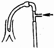 图1-19 小儿麻醉中常用的T管装置,箭头示氧气与挥发麻醉药进入处,下端为延长管,任其开放