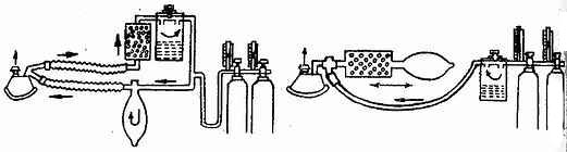 (二)紧闭法 吸入气和呼出气全由麻醉机控制,呼气中二氧化碳由钠石灰吸收。其特点是全麻深度能长时保持稳定不变,便于人工通气和呼吸管理,但呼吸阻力和器械死腔较大。紧闭法中又有循环式和来回式二种(图1-20),以循环紧闭式多用。