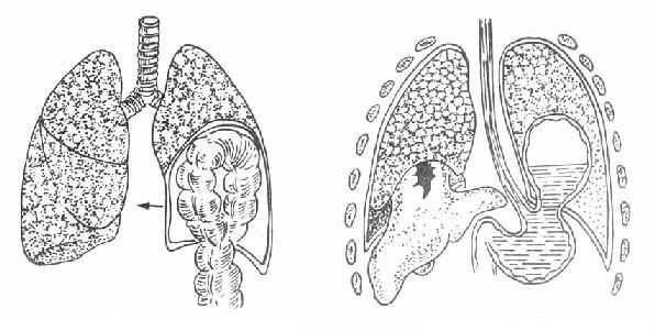 结肠(小肠、肾脏等)进入左胸腔中, 肝脏进入右胸腔,胃进