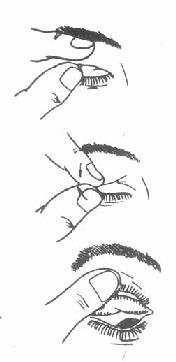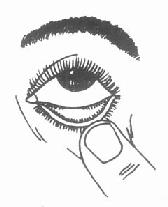 检查睑结膜和穹窿结膜时,须翻转眼睑。翻下睑比较容易,有拇指或食指将下睑往下牵拉,同时让被检者向上看,下睑结膜即可以完全露出。(图2--6)翻上睑的方法有二。单手法:较常用,先嘱被检查者向下看,将食指放在上睑部的眉下凹处,拇指放在睑板前面靠近睑缘,然后两指夹住眼睑皮肤等软组织,在把眼睑向前下方牵拉的同时,食指轻轻下压,拇指将眼睑向上捻转,上睑即被翻转。此法只用一手操作,简便而较易。(图2--7)双手法。让被检者向下看,以一手的拇指和食指夹住眼睑中央处的睫毛和睑缘皮肤,向前下方牵引,以另一手的食指置于眉下凹处,当牵引睫毛和睑缘向前向上翻时,眉下凹处手指向下稍压迫眼睑即被翻转。如用此法不能翻转上睑,可用玻璃棒或探针以代替眉下凹处的手指,就易于翻转。(图2--8)检查穹窿部结膜时,于上睑翻转后,拇指将睑缘压在眶缘上并向上牵引,同时嘱被检者用力向下注视,并以另一手指在下睑部轻轻向上推挤眼球,上穹窿部即可完全露出。对有角膜溃疡及眼球穿孔伤的病员,切忌压迫眼球,以免造成更大的损伤。