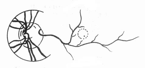 1.视网膜中央动脉(central retinal artery),在眶内从眼动脉发出,于眼球后约9-11mm处穿入视神经中央,从视盘穿出。多数情况下,首先在视盘上分出上、下两支,以后每一支再分出鼻侧、颞侧分支,即形成鼻上、鼻下、颞上、颞下四支,它们相互间不吻合,属终末动脉,分布于视网膜内。较大血管主要分布在神经纤维层内,分支到神经节 细胞层。在内网状层和内核层则为毛细血管。内核层以外的视网膜各层为无血管区,其营养供应来自脉络膜。颞上、下支向颞侧伸展围绕黄斑向中央分出毛细血管细支,但不到中心凹处,在黄斑区中心凹约0.5 mm直径范围内为无血管区。此处营养主要依靠脉络膜血管。