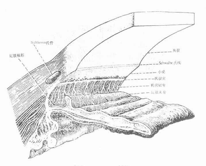角膜缘(limbus):是指从透明的角膜到不透明的巩膜之间灰白色的连接区,平均宽约1mm,角膜前弹力层的止端是球结膜的附着缘,后弹力层的止端是小梁网组织的前附着缘。在切面上,此两缘的联线就是角、巩膜的分界线,此区内角膜嵌入膜,在内外表面分别形成巩膜内沟和外沟。