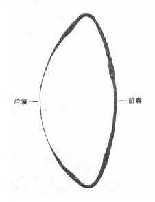(二)晶状体(lens)是一个双凸透镜状的富于弹性的透明体。位于虹膜、瞳孔之后,玻璃体之前,借晶体悬韧带与睫状体联系。晶体后表面的凸度大于前表面,是重要的屈光间质之一。后表面中央叫后极,前表面中央叫前极,显露于瞳孔中央。前后两面交界处叫赤道。成人晶体直径约9~10mm ,厚约4~5mm。(图1-15,1-16)