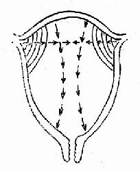 2.对称性和极性 正常宫缩起自两侧子宫角部(受起搏点控制),以微波形式迅速向子宫底中线集中,左右对称,然后以每秒约2cm的速度向子宫下段扩散,约15秒均匀协调地遍及整个子宫,此为子宫收缩的对称性(图40)。子宫收缩力以子宫底部最强最持久,向下则逐渐减弱,子宫底部收缩力几乎是子宫下段的两倍,此为子宫收缩的极性。