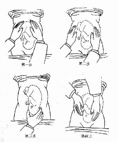 第一步 检查者面对孕妇头部,两手置于子宫底部,检查子宫底高度,根据其高度估计胎儿大小与妊娠月份是否相符,同时分辨在子宫底部是胎头抑或是胎臀。
