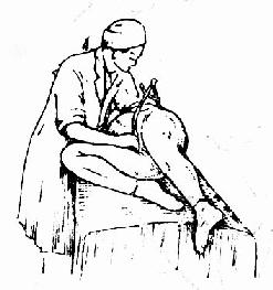 图33骶耻外径侧卧测量法 (上腿伸直、下腿屈曲)