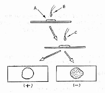 (2)乳胶凝集抑制试验 根据免疫学凝集抑制试验原理,先用hCG免疫家兔,制成抗血清。孕妇尿中含hCG(抗原),能与抗血清中的抗体结合,如再加入吸附hCG乳胶颗粒,由于抗体已被结合,就不会与乳胶颗粒再发生凝集反应。非孕妇尿中无hCG加入抗血清后不产生反应。加入乳胶颗粒后,其与抗体即结合,肉眼可见乳胶颗粒凝集。方法(图21):用有试验池的玻片,先向池中滴入尿液及血清各一滴,左右摇晃1~2分钟使之混匀,然后加入乳胶颗粒一滴,再摇2~3分钟使三者充分混合5分钟后观察结果,出现均匀一致的凝集小颗粒者为妊娠反应阴性,无凝集者为阳性反应。