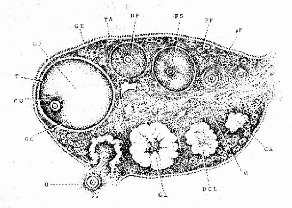 DCL 退化黄体 GE 生发上皮 CA 白体 TA 内膜 M 髓质