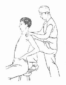 手法复位可在局麻下进行。病人坐在木凳上,双手插腰,肩部外旋后伸挺胸,医生部于背后,一脚踏在凳上,顶在病人肩胛间区,双手握住两肩向后、向外、向上牵拉纠正移位(图3-14)。