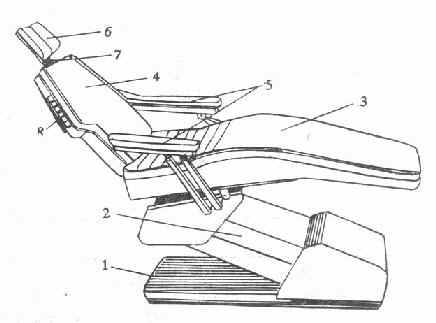 主要供口腔手术及口腔疾病的检查和治疗用。目前多采用电动式牙科椅,其主要结构分8个部分(图1),整机籍底板固定于地面,并通过支架将底板与牙科椅的上部联接,牙科椅的动作受控于椅背上的控制开关,其工作原理是:控制开关启动电动机运转并带动传动机构工作,使牙科椅相应部件产生移动。根据治疗需要,操纵控制开关按扭,牙科椅可完成上升、下降、俯、仰体位和复位等动作。