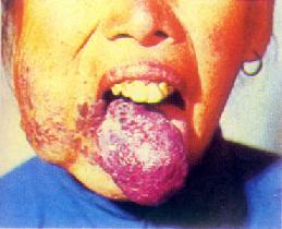 血管瘤是口腔颌面部常见的良性肿瘤。多属先天性,是由血管内皮增生而来。多见面部皮肤、皮下组织和口腔粘膜(如唇、舌、颊、口底等)(附图16,17)(图3-26,27)。一般可分为毛细血管型血管瘤、海绵状血管瘤及蔓状血管瘤。而以前两种常见。