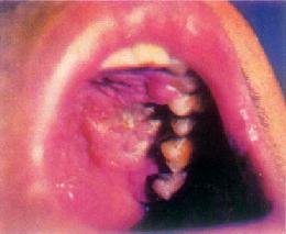 口腔癌常表现为溃疡型、浸润型和乳头型三种。初起时常为局部溃疡、硬结或小结节。一般无明显的自发性疼痛,随着癌肿迅速生长并向周围及深层组织浸润,可出现疼痛。硬结扩大、肿物外突、表面溃疡、或边缘隆起呈菜花状,基底硬,中心可有坏死,有恶臭。常伴有感染,表面易出血。不同部位的癌肿因破坏邻近组织、器官而出现不同的症状和功能障碍。如舌癌有明显的疼痛和不同程度的舌运动受限、影响吞咽、说话等功能,恶性程度较高,发展快,早期即可有淋巴结转移。龈癌常波及牙槽骨,易使牙齿松动或脱落,继续扩展可侵犯颌骨,在上颌骨可侵入上颌窦,在下颌骨可累及下牙槽神经,引起疼痛或麻木。