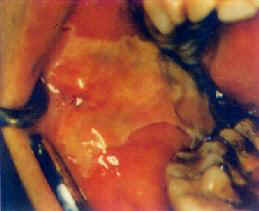 (二)重型(大型)口疮:该型又称复发坏死性粘膜腺周围炎(Periadenitis.Mucosa Necroti-ca Recurrens,PMNR)或腺周口疮。此型较少见,溃疡面大而深,直径可达10~30mm,深及粘膜下层的粘液腺或腺周组织,溃疡底微硬,边缘不齐且微显隆起(附图3),愈合后常留下疤痕,溃疡疼痛较剧,病程可长达数月或更久,但仍有自限性、复发性,这型溃疡有由口腔前份向后份发展的倾向,经多年发作后溃疡常发生在舌腭弓、软腭、悬雍量等部位,溃疡数目为1~2个大溃疡,周围或有数个小溃疡,患者全身情况好。此型可通过溃疡的好发部位、溃疡特点、有无复发性、自限性、全身情况及活检与特异性溃疡或肿瘤鉴别。