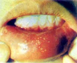 (二)疱疹性口炎:多见于6岁以下儿童,尤其是6个月至2岁,多为原发性。开始多有发烧、头痛、全身不适等先驱症状,2~3天后口腔开始出现症状,初起口腔粘膜呈片状充血,随后出现成簇的小水疱,水疱迅速破裂,形成表浅的小溃疡,直径约1~2mm,溃疡可相互融合成边缘呈多环状的较大溃疡,上有假膜覆盖,颌下淋巴结肿大,患儿因痛而哭闹、拒食、流涎、病程一般1~2周,有的病损延及牙龈,牙龈边缘红肿易出血,甚至出现小溃疡,又称疱疹性龈口炎(附图4)
