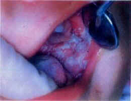 (一)急性坏死性龈口炎:多见于儿童,早期牙龈边缘及龈乳头红肿,以后迅速坏死,使龈缘变平,龈乳头刀削样缺损,表现覆以灰褐色污秽假膜(附图5),患处牙龈极易出血,疼痛明显,口内有特殊口臭,此为坏死性龈炎,如得不到控制甚至可使牙槽骨暴露、骨坏死、牙齿松动脱落。有的患者还可波及与牙龈病损相应的唇、颊粘膜,使局部粘膜坏死,溃疡较深,上覆灰黑色假膜,周围粘膜充血、水肿,此称坏死性龈口炎。重症者可有低热、疲乏、颌下淋巴结肿大和白细胞轻度增高。
