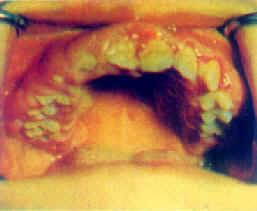 牙龈肿胀肥大,呈深红色或暗红色,组织松软,探诊易出。牙龈乳头呈球状突起(附图1)。肿胀的牙龈常可覆盖前牙唇的1/3或更多。由于牙龈肥大,使龈沟加深而形成龈袋,袋内易藏食物,细菌易滋生,自洁作用差,故炎症加重,可有深性分泌物。若身体抵抗力降低时,可出现单发或多发性的龈脓肿,特别以龈乳头区较多见。