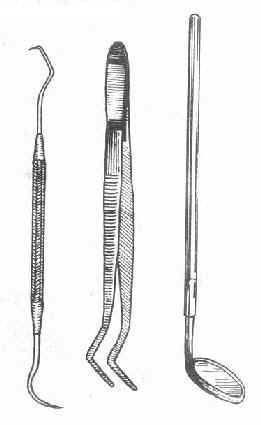 口镜:主要有三种用途:①反映视线不能直达部位的影象。如牙齿的远中面、舌面和上颌牙的合面等。②可用以反向或聚集光线到检查部位,增加局部照明,必要时可用凹面口镜放在影象。③用以牵引或拨压唇、颊、舌等软组织以利检查或手术。其柄端亦可作叩诊之用。