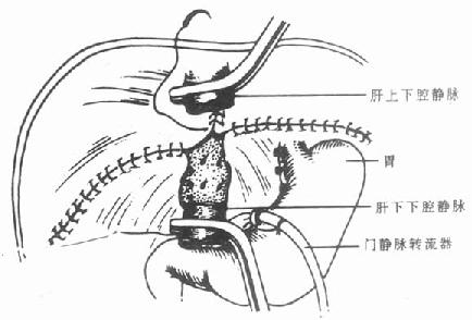 背驮式肝移植时,也可以使用静脉转流泵。此时,只要行腋静脉和门静脉置管即可。由于下腔血流不被阻断,因此,可不需经大隐静脉置管至下腔静脉行静脉转流。而且,近来越来越多的人认为,在行背驮式肝移植时,不使用静脉转流泵,可以减少术后由静脉转流泵所造成的如体温过低、门静脉血栓等一系列并发症。也有人通过门静脉和腔静脉行端侧吻合建立暂时性门腔分流术来缓解肠道淤血回题[4,5]。(图6-6)