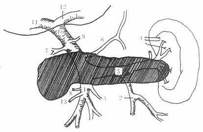 1.肠系膜上静脉2.肠系膜下静脉3.胃网膜右静脉4.胃短静脉5.脾静脉6.冠状静脉7.胃十二指肠上静脉8.胃十二指肠下静脉9.副胰静脉10.门静脉11.门静脉右干12.门静脉左干13.中结肠静脉