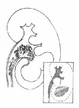 图6-30 肾盂肿瘤及其肾盂造影所见肾盂乳头状癌,