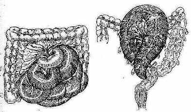 (二)在上述解剖因素的基础上,如肠袢本身的重量增加,由于重力的关系容易促使扭转发生,扭转后也不易自行复位。所以在临床肠扭转常见于饱餐、食物内纤维残渣多、大便秘结,肠腔内有蛔虫团、肠壁上有较大肿瘤、先天性巨结肠等情况下。
