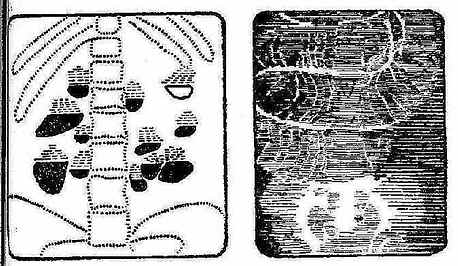 (六)X线检查:腹部X线平片检查对诊断有帮助,摄片时最好取直立位,如体弱不能直立可取左侧卧位。在梗阻发生4~6小时后即可出现变化,可见到有充气的小肠肠袢,而结肠内气体减少或消失。空肠粘膜的环状皱壁在空肠充气时呈“鱼骨刺”样。较晚期时小肠肠袢内有多个液面出现,典型的呈阶梯状。(图2-56)