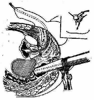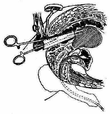 盆腔感染尚未形成脓肿时,可选用适当的抗菌素治疗,热水坐浴、理疗,或用温水灌肠(41℃~43℃),在保守治疗过程中反复肛指检查,一旦脓肿形成肛指即触到包块软有波动感。应立即行盆腔脓肿切开引流术。手术方法是使病人在手术床上取截右位,用肛镜显露直肠前壁在包块波动处用长粗针头穿刺(图2-44)。抽得脓液后,穿刺针暂不拔出,用尖刀沿穿刺针方向切一小口,再用直止血钳插入脓腔扩大引流口,放尽脓液后,放置软橡皮引流条引流(图2-45)(图2-46)。术后第3~4天拔去引流物。对已婚妇女,脓肿向阴道突破者,可经阴道后穹窿切开引流(图2-47)。